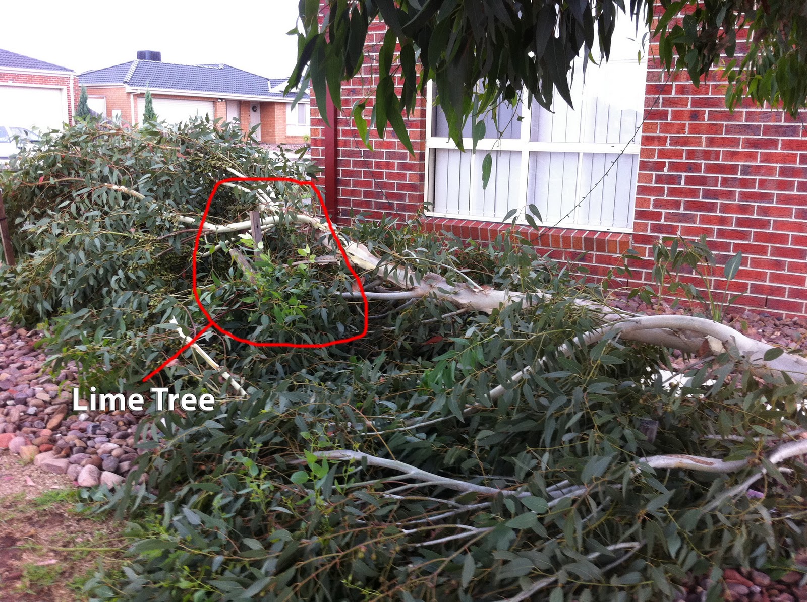 After publishing this post this morning, I went outside to have look-see how the christmas lights survived the storm (they didn't), and found a huge gum tree branch had fallen across our new plants (see photos). I had to chop it up with an axe to get it off the plants.